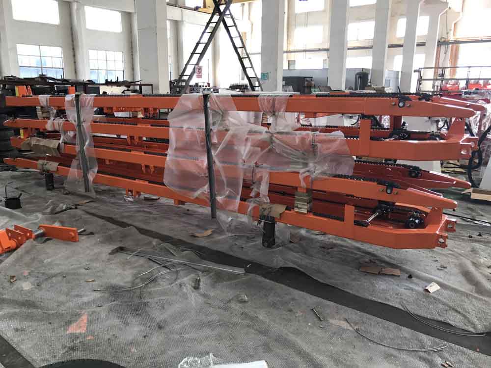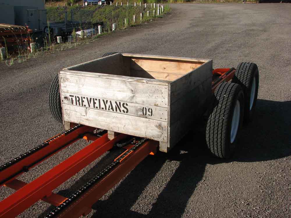 A hydraulic motor and heavy forklift chain transport the bins up and down the trailer.