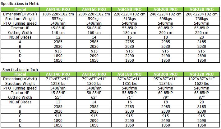 AGF-PRO verge flail muchers are super heavy duty mowers designed for Cat-II tractors. They feature very heavy 43 ounce cutting blades that can chop heavy brush including grasses, debris, sticks, vines, branches and other wooded materials up to 4” in Diameter.