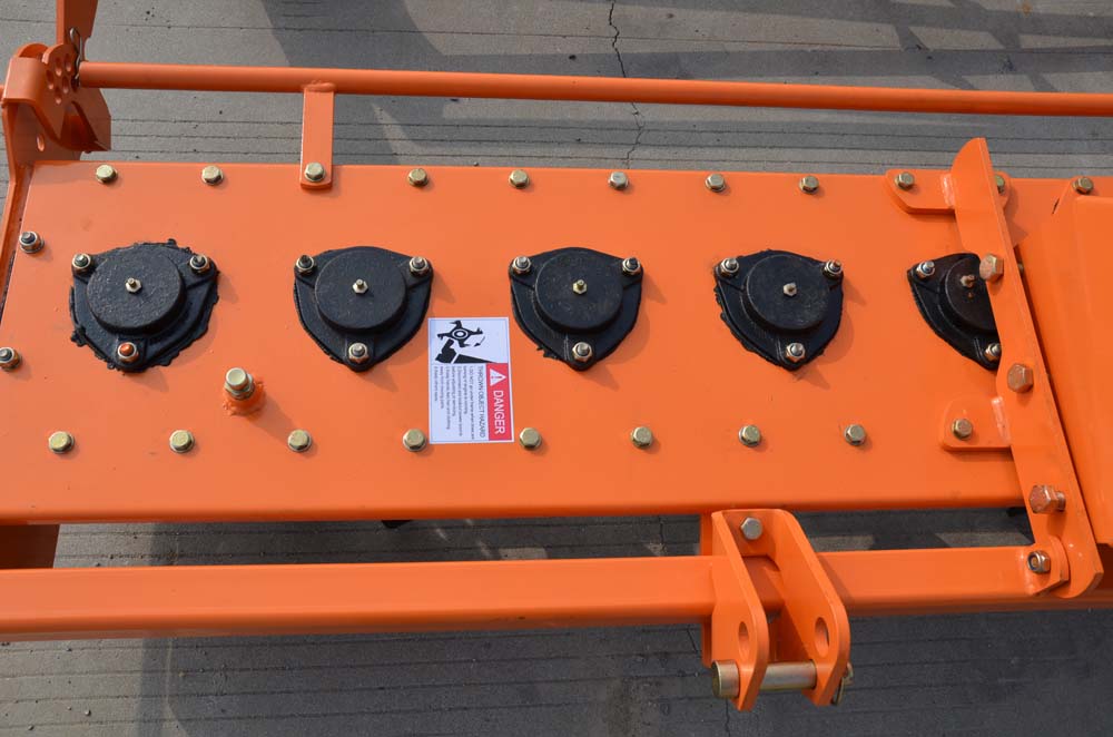Optimal soil break-up. Ideal distribution between fine soil in depth and larger sods on the surface, which prevents a surface crust from forming. The rotary blade movements exercise a horizontal and not a vertical pressure on the soil, preventing the formation of a hard layer at the depth. Versatility and all-purpose use: adaptation to most soil conditions and excellent capability of working virgin land. Optimal stubble/trash burying in the upper soil layer. In particular, the use of specific blades (on grip) produces a perfect soil re-mixing even in large amounts of stubble/trash. Perfect soil leveling. Easy depth control allows quick and easy shallow weed control. The rotary harrow will leave the soil with worms still intact and alive – aiding the natural structure of the soil. Perfect for cover crop mixing. The spade blades lift and tumble the soil, thoroughly mixing it, breaking up any clods and leaving a prepared and undamaged soil structure, which is fully de-compacted and aerated. This ability to mix and blend, is a huge advantage when incorporating stubble and previous crop residue, as well as large quantities of composts, slurry, manure and other organic materials. · Structure Weight: 617 lbs · Gear Box HP: 50 HP · No. of Blade: 12 · Tiling Width: 51.2" · Tiling Depth: 7.9" · PTO Turning Speed: 540r/min · Tractor PTO HP: 25-40 HP John Deere, Kubota, Massey Ferguson, Ford, New Holland, International, Jinma, Yanmar, Mahindra, Montana, Branson, Case, Cub Cadet, Farm Pro, Farmall, Foton, Iseki, Kioti, Mitsubishi, Nortrac, Rhino, SAME, Satoh, TYM, Tytan, Zetor