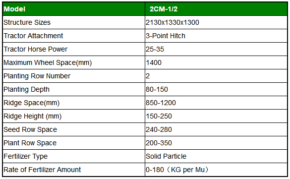 The Potato Planter is designed for modernized agricultural industry. It combines both economic planting cost and high productivity efficiency. It is approved that every index is better when planting by 2CM-1/2 than planting by manual operation.